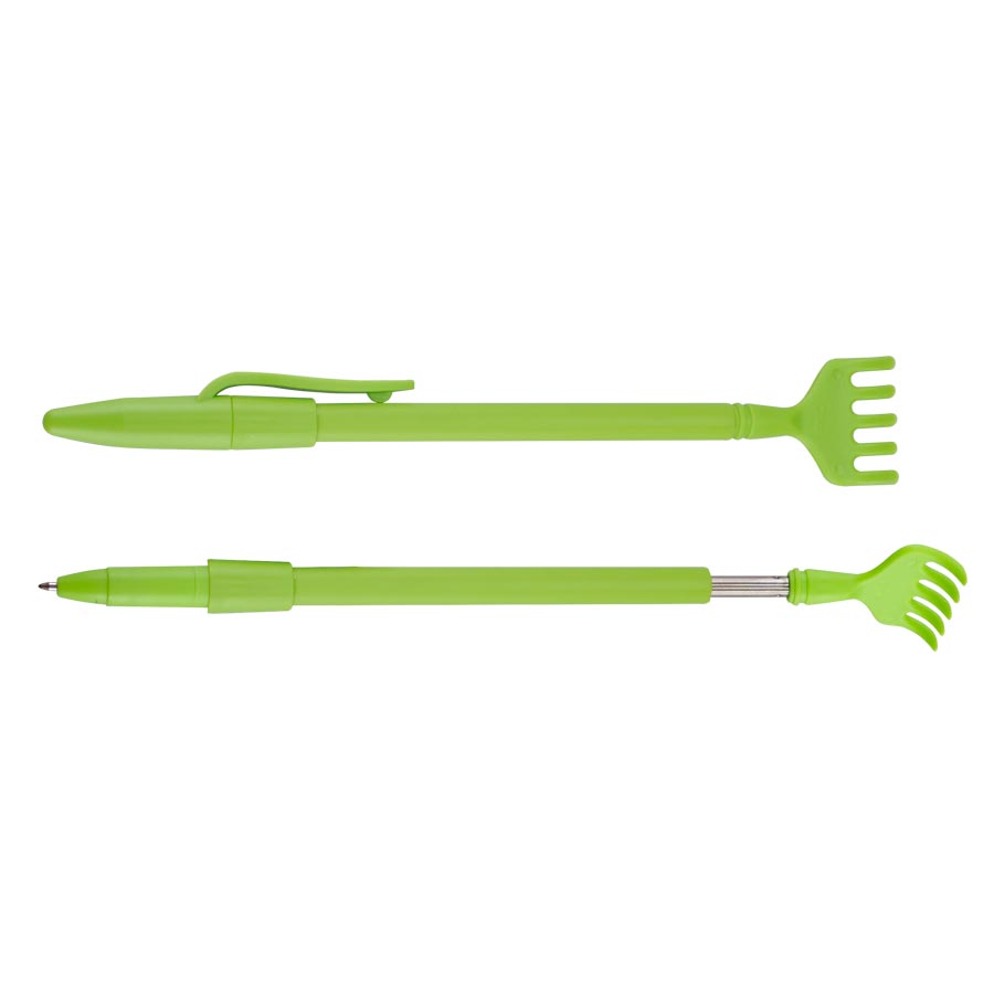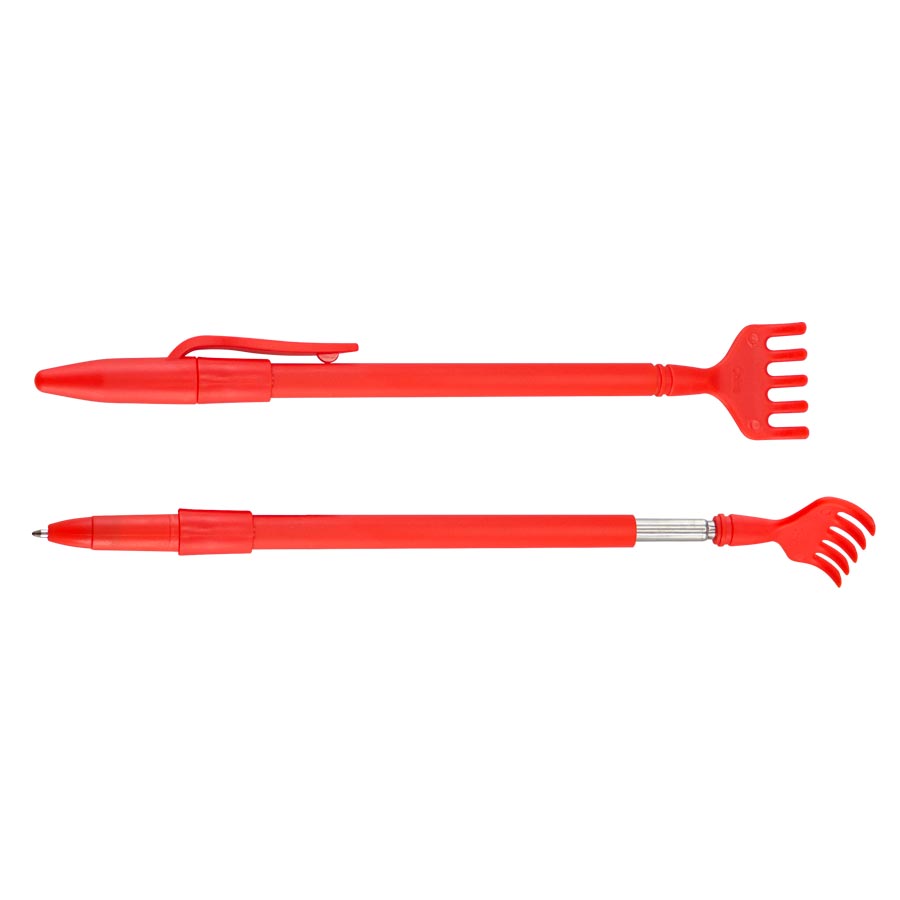 Bolígrafo plástico de color con tapa, con Manito Rascadora expansible (tipo antena). Escritura azul.