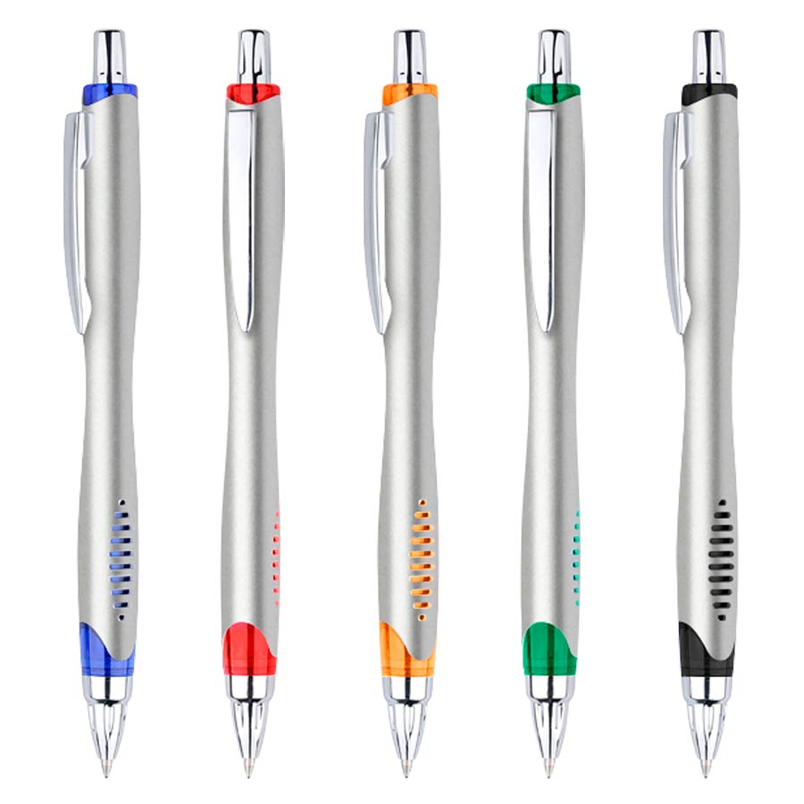 Bolígrafo plástico plateado «Motion». Escritura Azul.