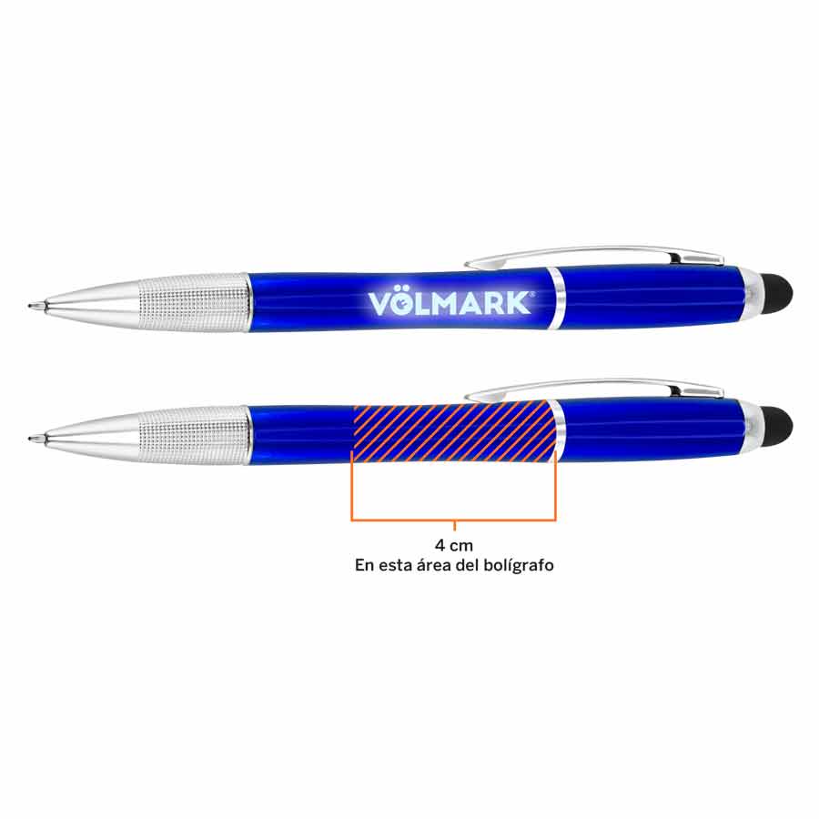 Consulte y revise la ubicación de grabado láser del logo, ya que la luz LED ilumina una única posición dentro del bolígrafo. La longitud de iluminación LED es de 4 cm, exactamente sobre la posición indicada.
