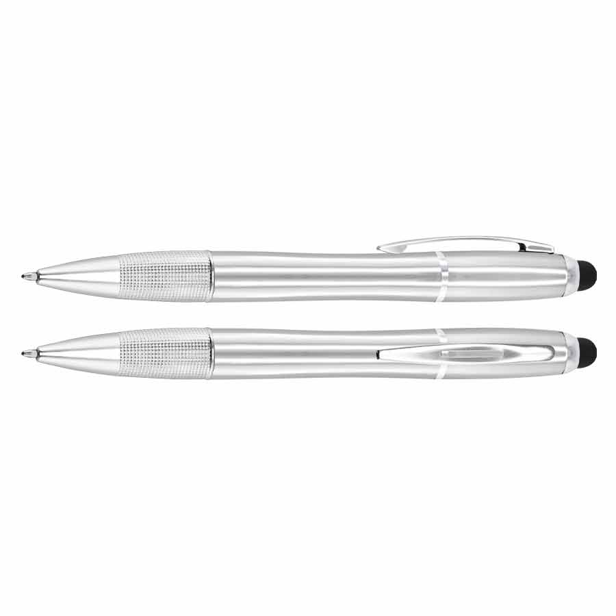 Bolígrafo plástico con puntero screen-touch al tono, modelo «NEON». Incluye luz LED al interior, para retroiluminar logo grabado sobre el cuerpo del bolígrafo. Escritura azul.
