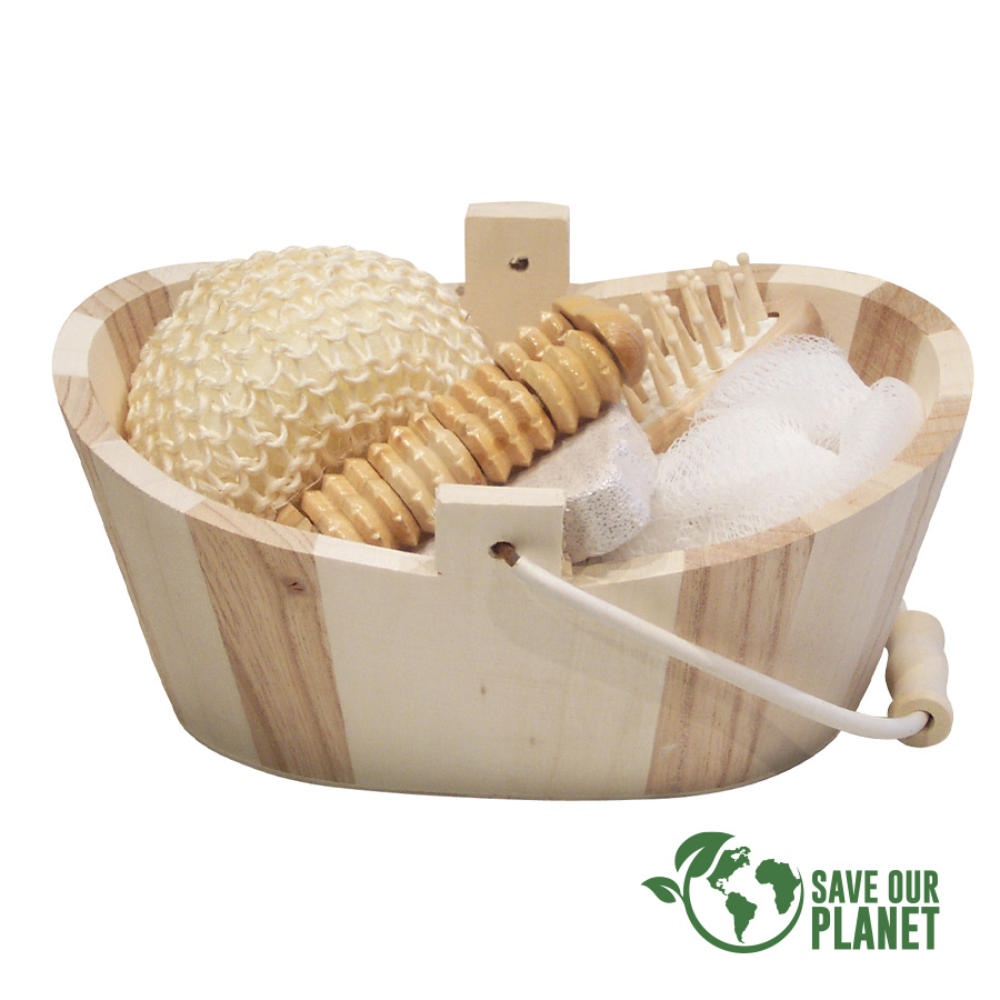Canasto SPA de belleza en madera modelo «Naturals». Contiene cepillo de pelo, esponja malla, masajeador de madera, piedra pomez y esponja de masaje corporal.